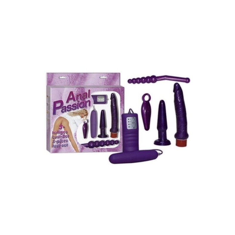 Kit del piacere viola composto da 5 pezzi: Vibratore (18 cm, Ø 2,5-3 cm) e una eccellente scelta di Sextoy per giochi sessuali versatili "dalla porta di dietro".